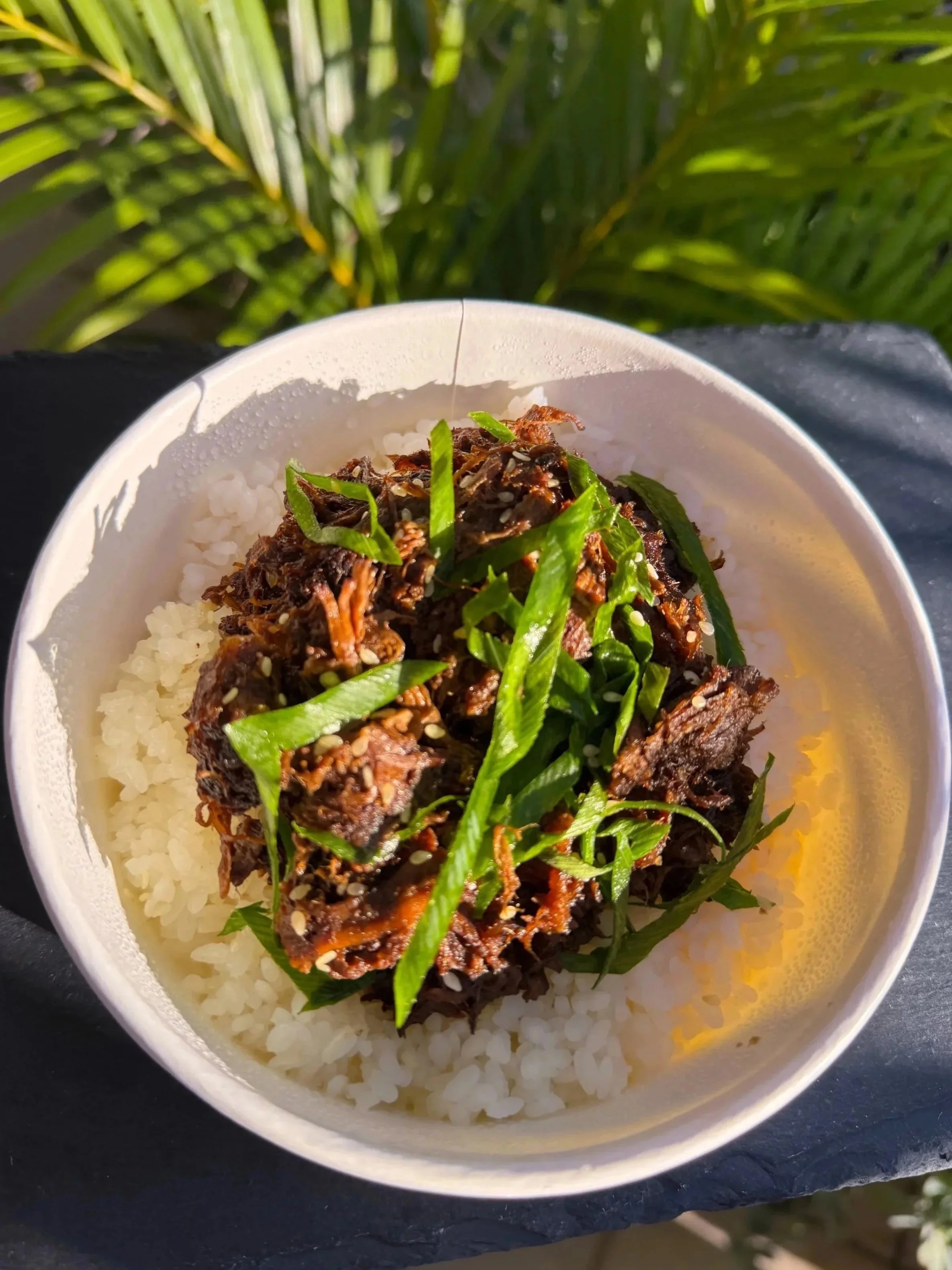Slow-cooked chuck beef simmered in a rich, savoury-sweet blend of white miso, ginger, garlic, and brown sugar until melt-in-your-mouth tender. It’s deeply umami, with a warm gingery kick and just enough sweetness to balance the bold miso base. Served over fluffy sushi rice with a drizzle of sesame oil to tie it all together, this bowl delivers serious flavour and comforting satisfaction.