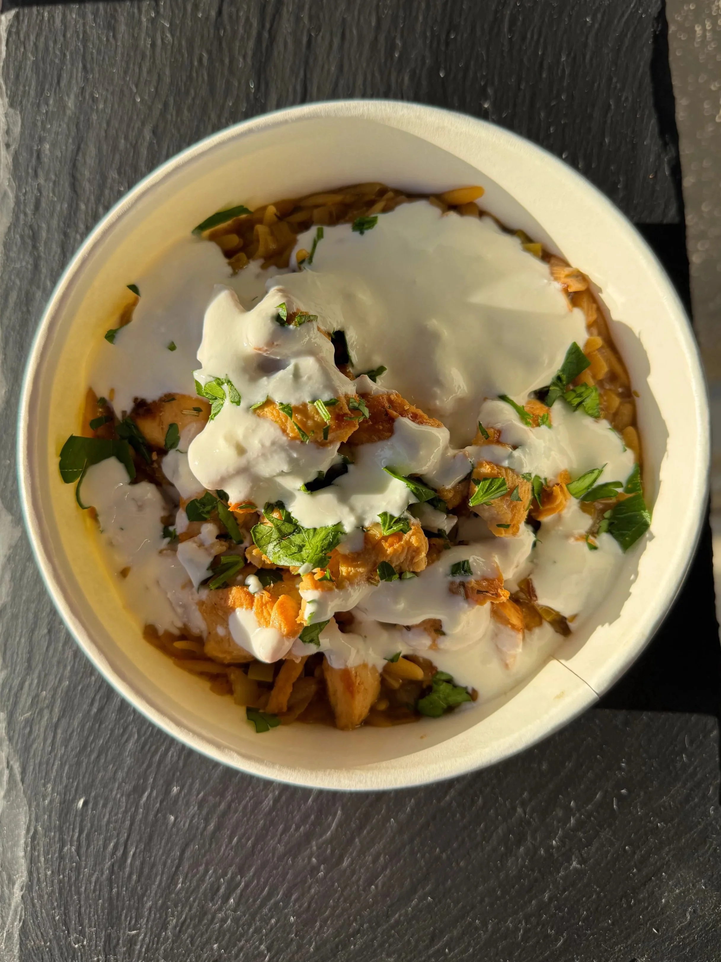 Slow-cooked leeks — one of winter’s most underrated veg — melt into a buttery, savoury orzo base, infused with herbs and golden chicken stock. On top, lemon and garlic grilled chicken breast brings brightness and depth, finished with a generous drizzle of creamy yoghurt sauce and a fresh burst of parsley. It’s light yet deeply satisfying — a silky, flavour-packed bowl of comfort layered with herbs and seasonal goodness.